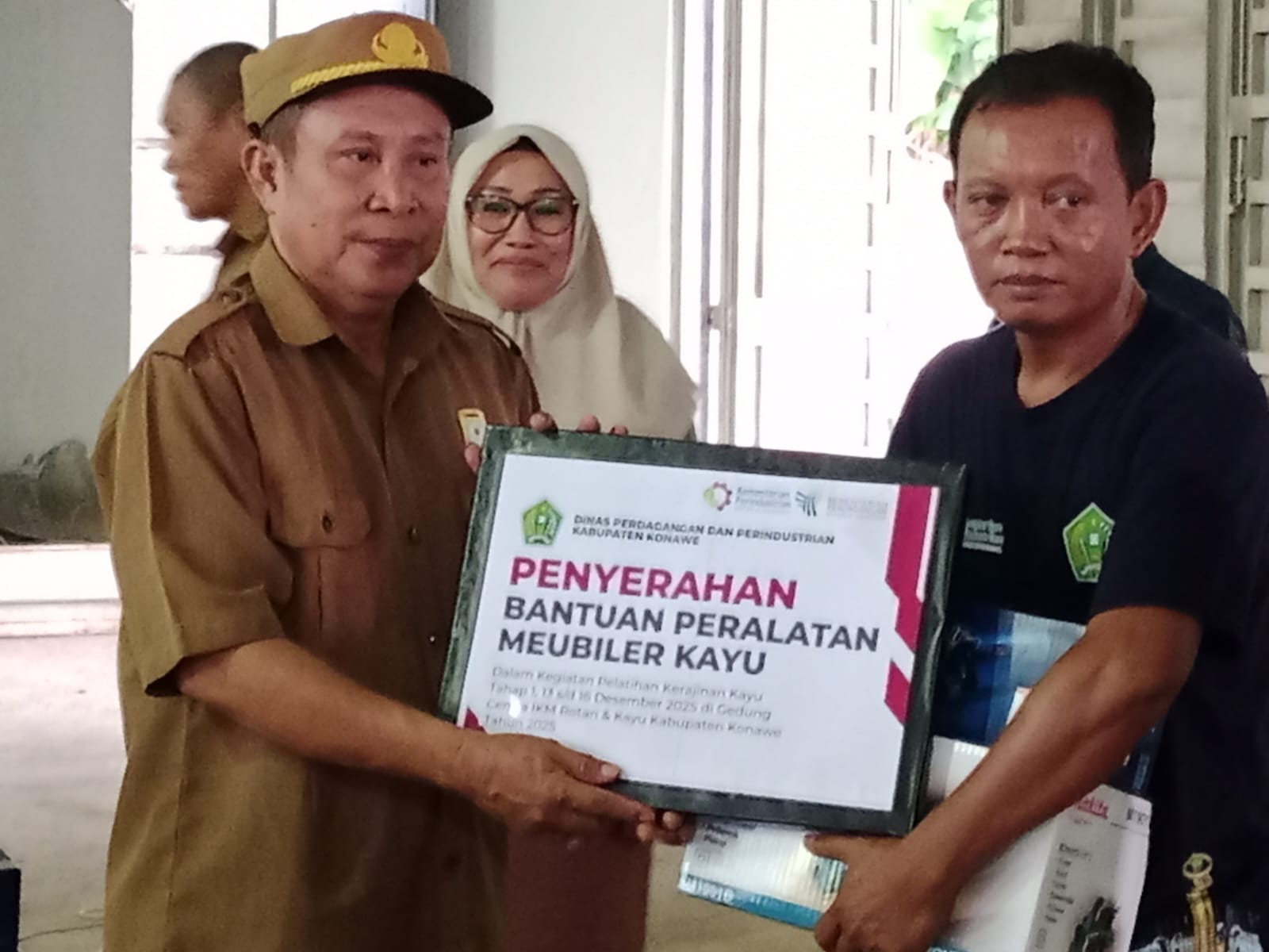Konawe, 16/12/25 — Asisten III Bidang Administrasi Umum Sekretariat Daerah Kabupaten Konawe, Mudarman Pagala, S.Sos., M.Si., mewakili Bupati Konawe, secara resmi menutup kegiatan Pelatihan Keterampilan Meubelir Kayu yang diselenggarakan oleh Dinas Perindustrian Kabupaten Konawe.