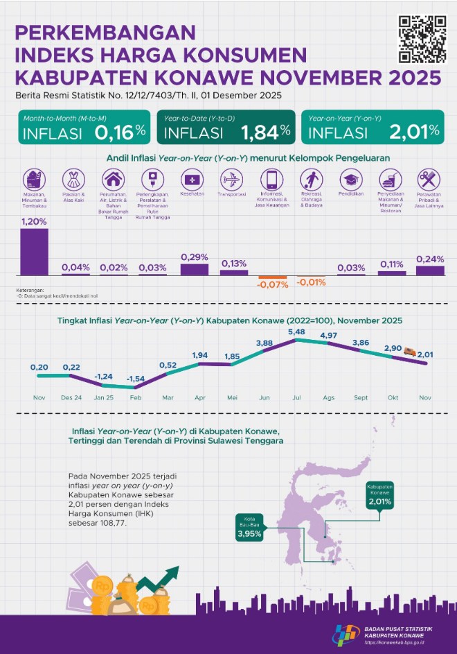 Pada November 2025 terjadi inflasi year on year (y-on-y) Kabupaten Konawe sebesar 2,01 persen dengan Indeks Harga Konsumen (IHK) sebesar 108,77.