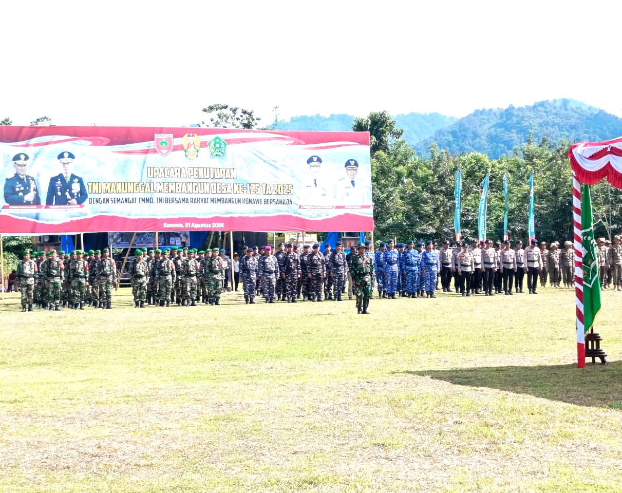 Konawe – DANREM 143/HALUOLEO Brigjen TNI Raden Wahyu Sugarto, S.I.P.,M.Han, memimpin langsung upacara penutupan TNI Manunggal Membangun Desa (TMMD) ke-125 Tahun 2025 yang digelar di Kec. Asinua Kabupaten Konawe. [21/8/25]