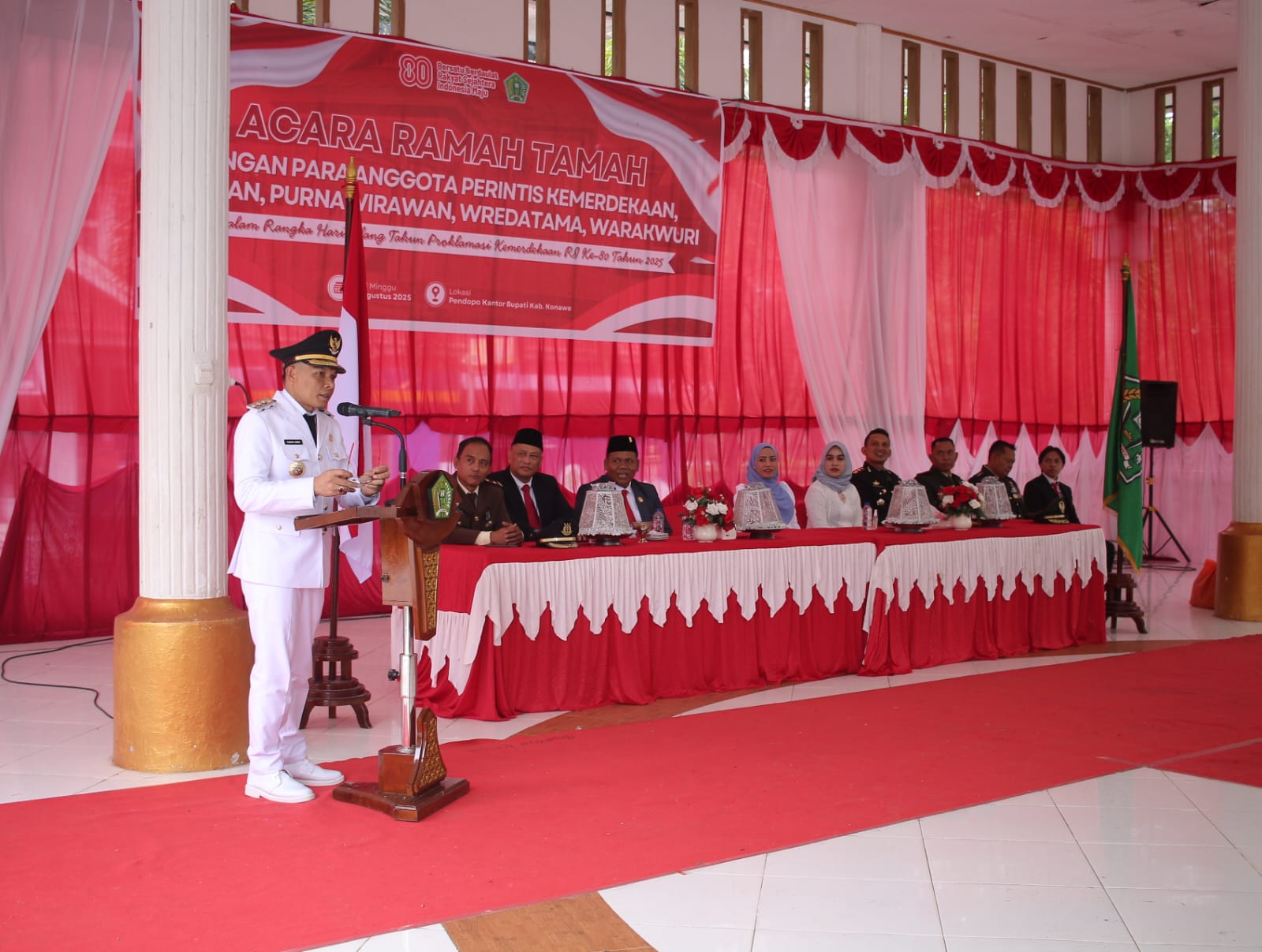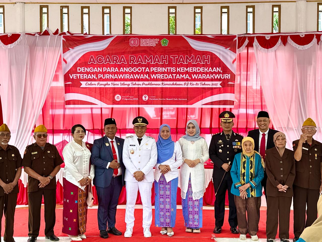 Unaaha – Dalam rangka memperingati Hari Ulang Tahun (HUT) ke-80 Kemerdekaan Republik Indonesia, Pemerintah Kabupaten Konawe menggelar acara ramah tamah bersama para anggota Perintis Kemerdekaan, Veteran, Purnawirawan, Wredatama, dan Warakawuri. Acara berlangsung khidmat di Aula Merah Putih Kantor Bupati Konawe, Minggu (17/8/25).