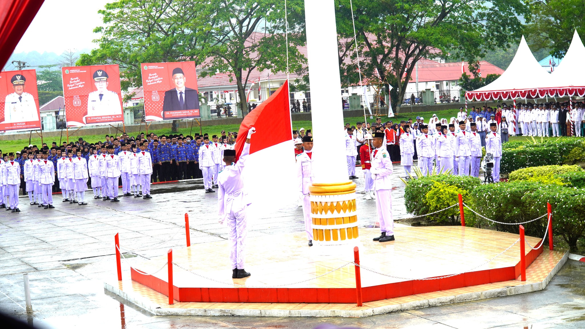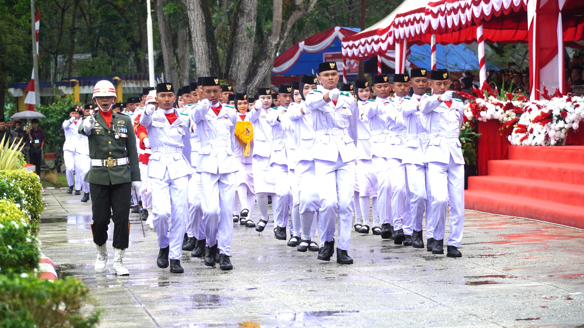 Meski kondisi cuaca kurang bersahabat, jalannya upacara tetap berlangsung dengan penuh khidmat. Para peserta tetap tegap berdiri, sementara pasukan pengibar bendera pusaka (Paskibraka) sukses mengibarkan Sang Merah Putih dengan sempurna.