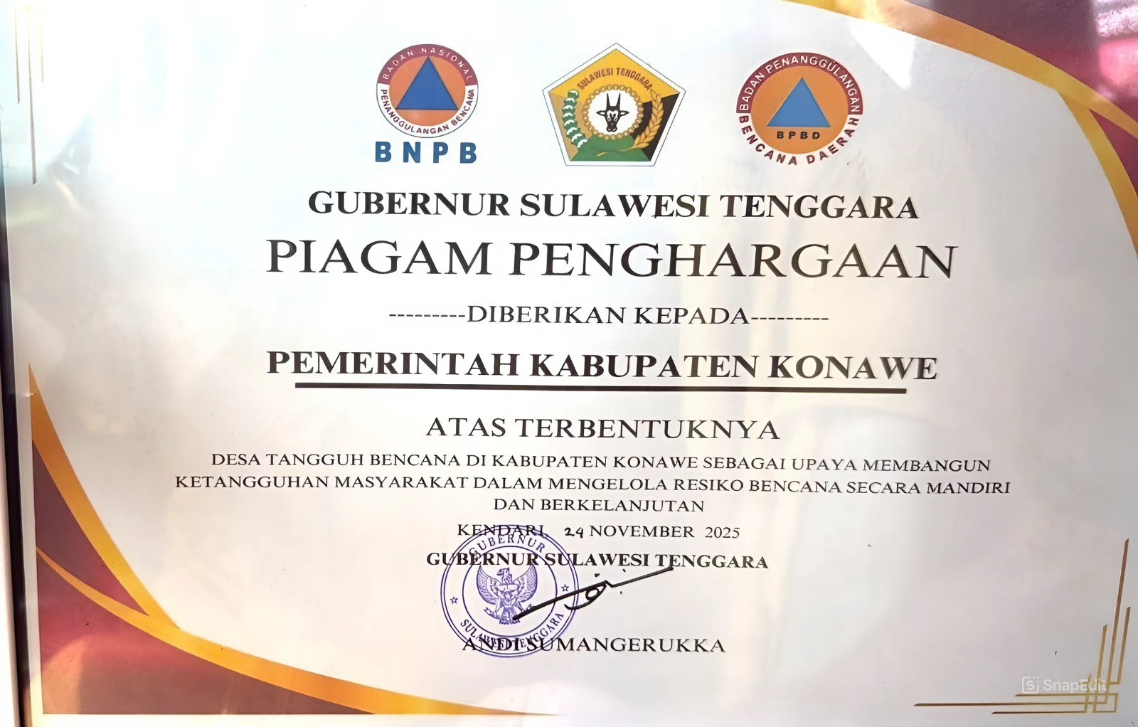 Wakil Bupati Konawe, H. Syamsul Ibrahim, SE.,M.Si, menyampaikan rasa terima kasih dan kebanggaannya atas penghargaan tersebut. Ia menegaskan bahwa Kabupaten Konawe akan terus memperluas pembentukan Desa Tangguh Bencana di seluruh wilayah sebagai bagian dari upaya mewujudkan masyarakat yang aman, siaga, dan tangguh terhadap bencana.
