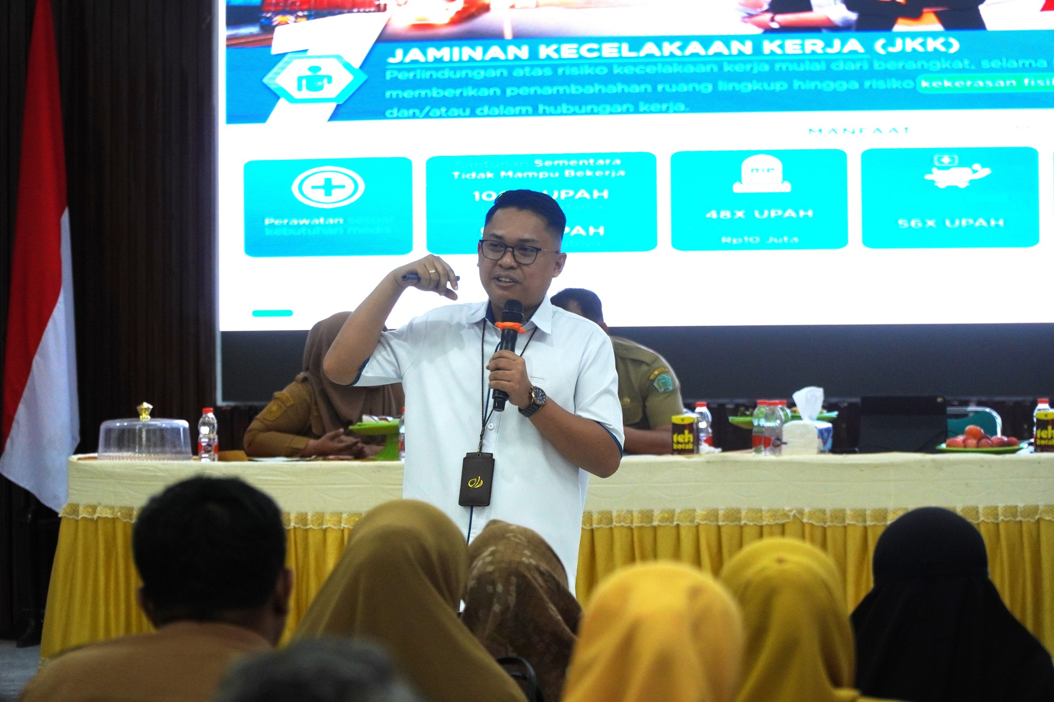 Setelah penyampaian sambutan oleh Sekda, kegiatan dilanjutkan dengan pemberian materi oleh perwakilan BPJS Ketenagakerjaan. Dalam sesi tersebut, narasumber menjelaskan berbagai manfaat program jaminan sosial, termasuk Jaminan Kecelakaan Kerja (JKK), Jaminan Kematian (JKM), serta mekanisme pendaftaran bagi pekerja rentan dan Non ASN. Perwakilan BPJS juga memaparkan pentingnya kepesertaan pekerja terhadap BPJS Ketenagakerjaan sebagai bentuk perlindungan finansial dari risiko kecelakaan kerja, penyakit akibat kerja, hingga jaminan bagi ahli waris.